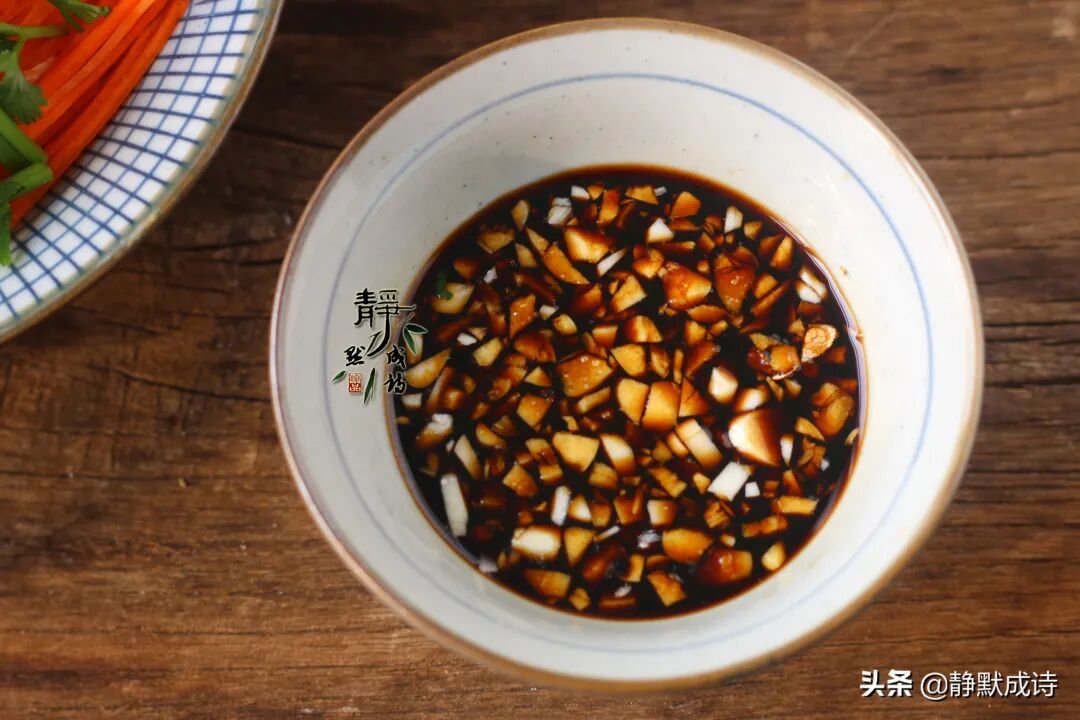 5、蒜切成蒜蓉状,放进碗中,加入酱油、陈醋、白糖、香油和少许盐,拌匀,这调料汁儿就做好了。白糖有一点点就可以,很提鲜。