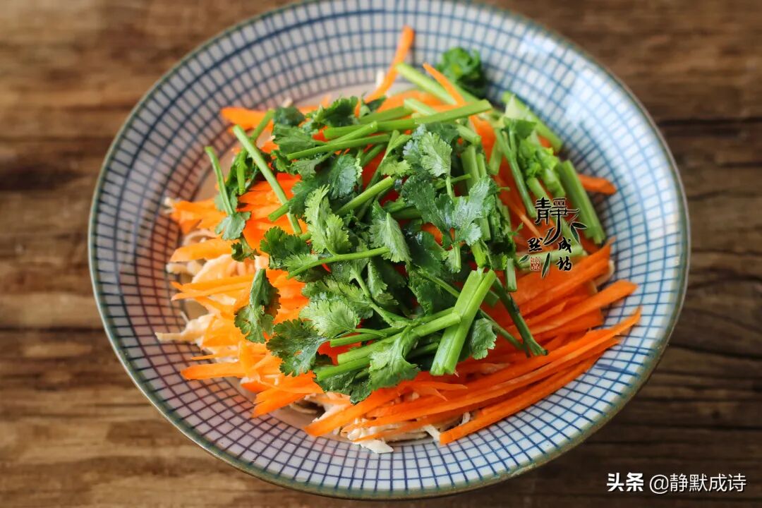 【食材】:鸡胸1小块儿、胡萝卜半根、香菜1棵、蒜3瓣、料酒1汤匙、酱油1汤匙、陈醋两汤匙、白糖少许、香油适量、盐少许。