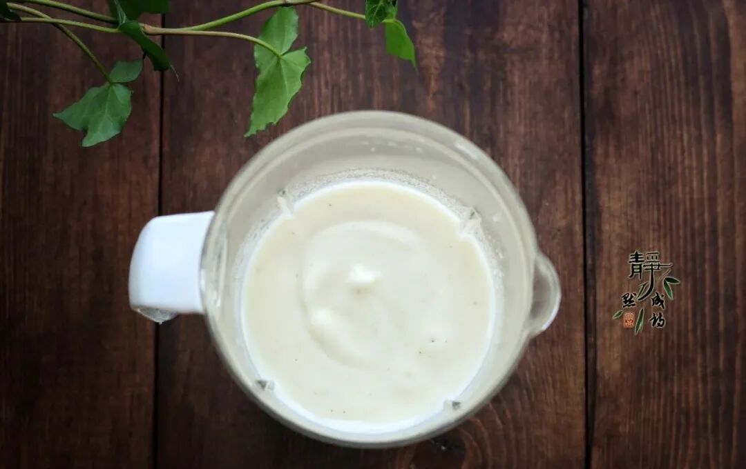 3、把山药、黑胡椒碎、盐和高汤一起放进料理机内桶,高汤不要一次性加入,防止山药泥太稀。然后启动料理机把它们打成半流动的山药泥。