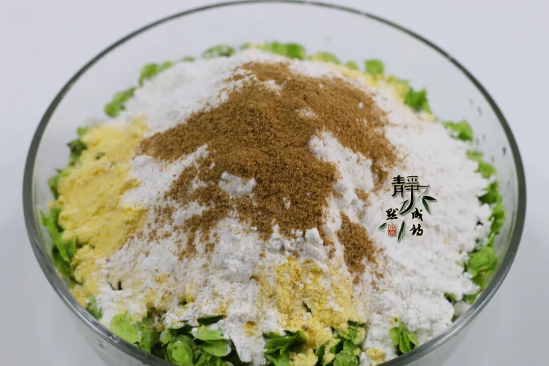 5、往榆钱中加入适量面粉和玉米面粉,不要多,它们起一个粘合作用,再加入十三香和盐,最后放点儿碱面或是小苏打。碱面和小苏打,可使得青菜在高温的蒸制中保持绿色不变色。