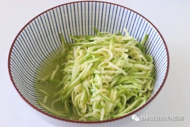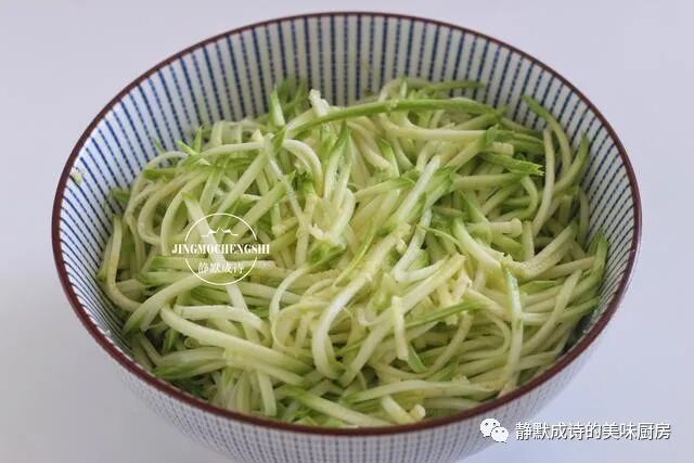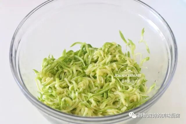 4、把西葫芦洗净,擦成细丝,西葫芦的皮不必去掉,皮也很嫩的。然后放入6克盐,不能再多,不然这馅儿会咸。搅拌均匀之后让它静置20分钟左右。