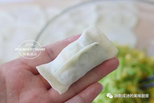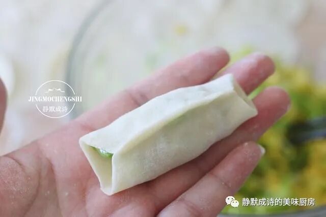14、但我们是素锅贴,为防止锅贴在煎的过程中流汤汁,所以要把它的两头也捏住,同样如图所示。