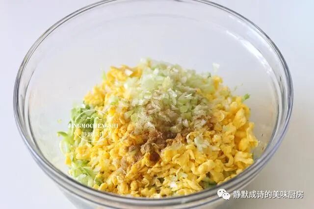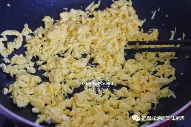 6、炒锅加油烧热,淋入蛋液,马上用筷子不停地搅拌,炒成小块儿,如此炒蛋,炒出来的都是恰好能入馅儿的鸡蛋块儿,不必再切或剁成小块儿。之后把蛋晾凉。