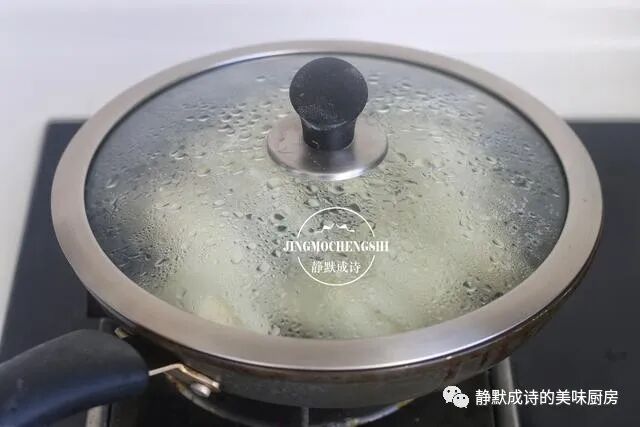 16、然后小火煎1-2分钟,待油开始滋啦啦地响,就可以淋水了,淋入小半碗清水,水量以刚刚没过锅贴底部为宜。盖好锅盖,小火煎上两三分钟,一定要小火煎,火候很关键。