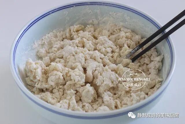 2、下手,把面絮和成面团,面团不必太光滑,成团即可。