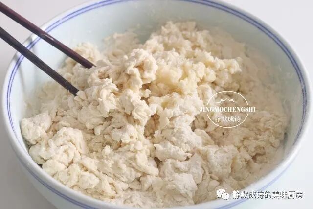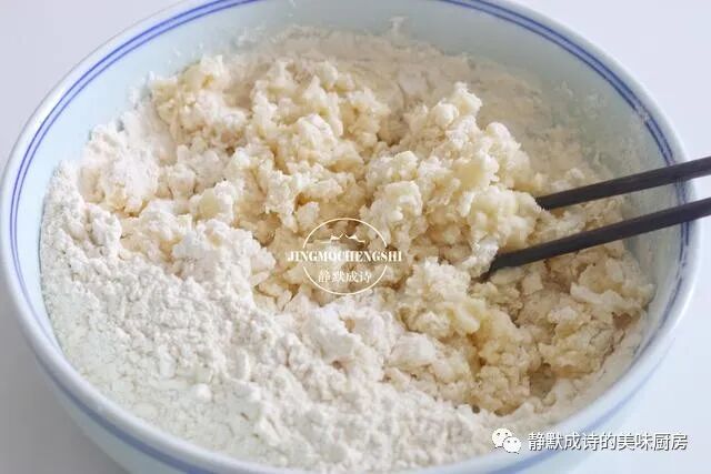 1、取普通面粉,准备好开水和清水。用筷子在面粉中间划个界限,一半淋入开水,边淋水边搅拌成面絮状。