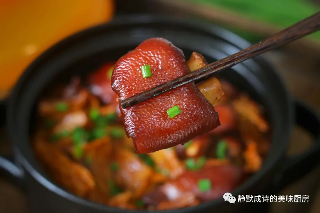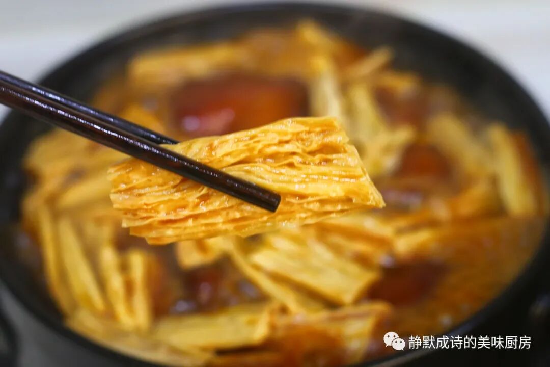 9、40分钟后,加入腐竹段,继续炖15-20分钟左右,即可关火,撒上葱花,这道下饭菜就成了。