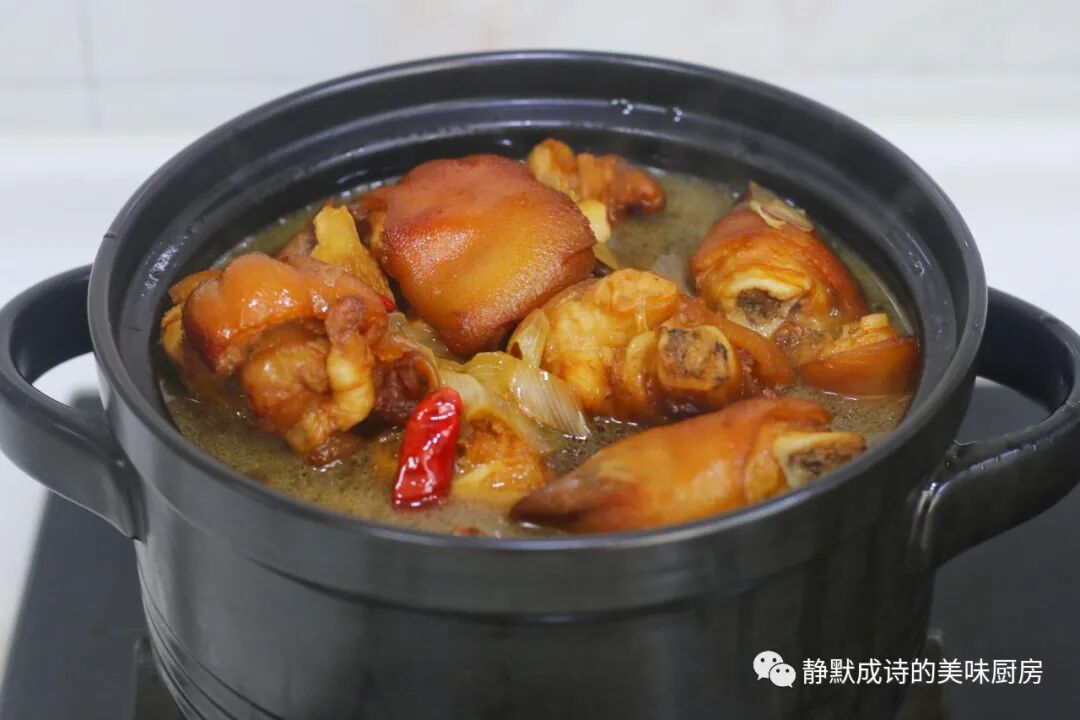 【食材】:猪蹄3只、纯黄豆腐竹1把(干)、葱姜干辣椒适量、冰糖1小把、生抽2汤匙、老抽1/2汤匙、黄酒2汤匙、八角2个、油盐适量。