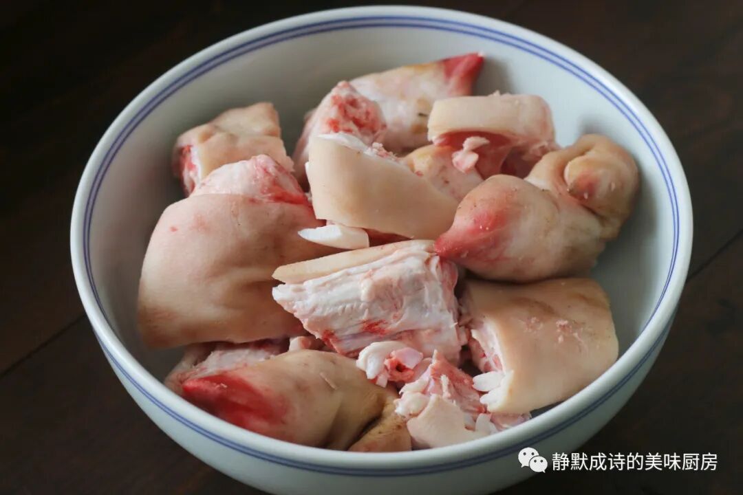 3、猪蹄洗净,剁成小块儿。如果想偷懒,就让卖家帮忙把猪蹄剁好。