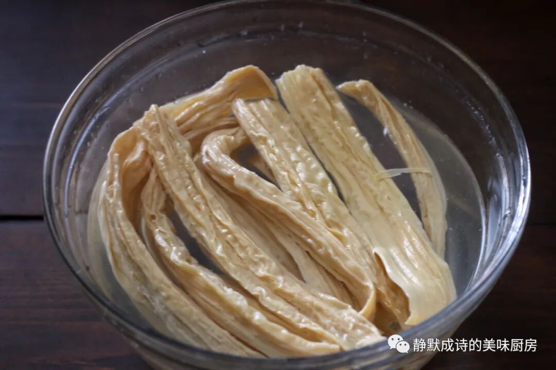 2、把干腐竹用冷水浸泡3-5个小时,把它泡开泡软。