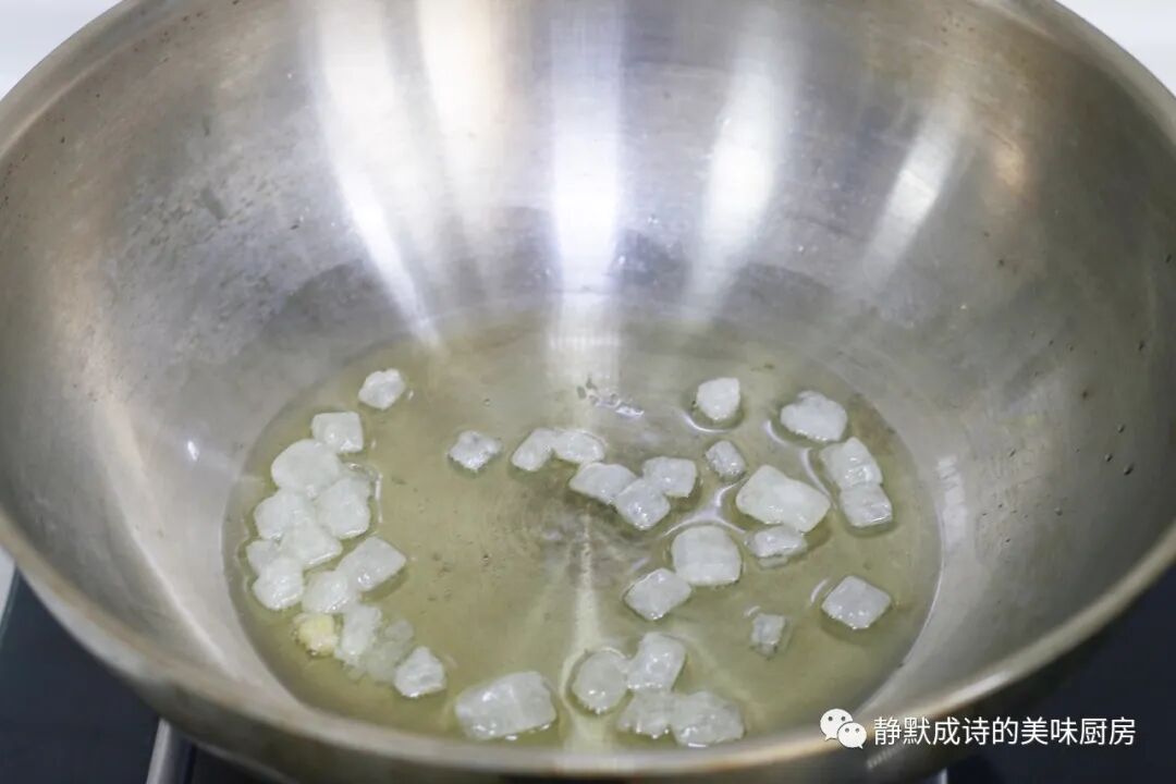 6、热锅冷油,加入冰糖小火炒糖色。炒糖色稍稍要点儿技术,但是熟能生巧,做的多了就没有技术可言了。