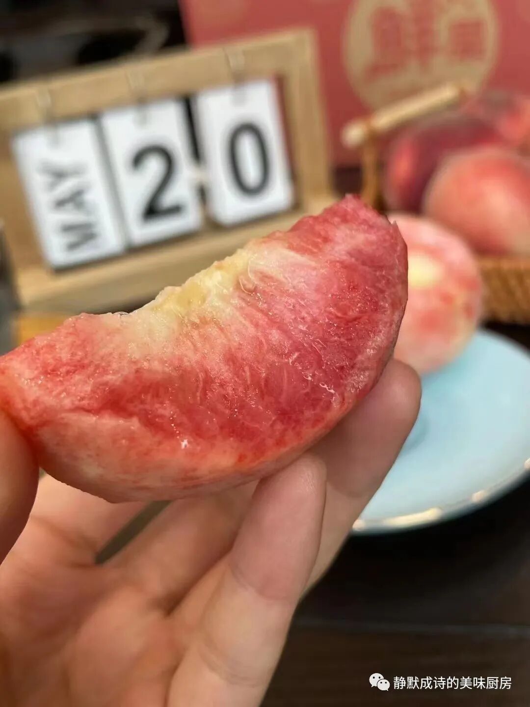 它是全国第一款成熟的桃子,个头不大,果肉带有血丝,口感脆甜,可放软。