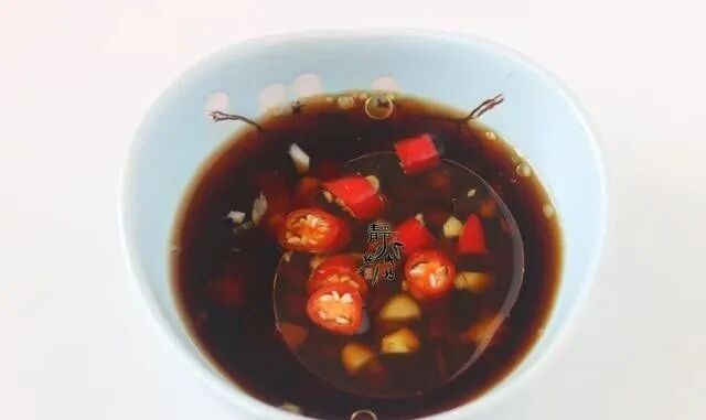 4、然后用鲜酱油、陈醋、花椒油、少许盐、小米椒圈调一个碗汁儿。