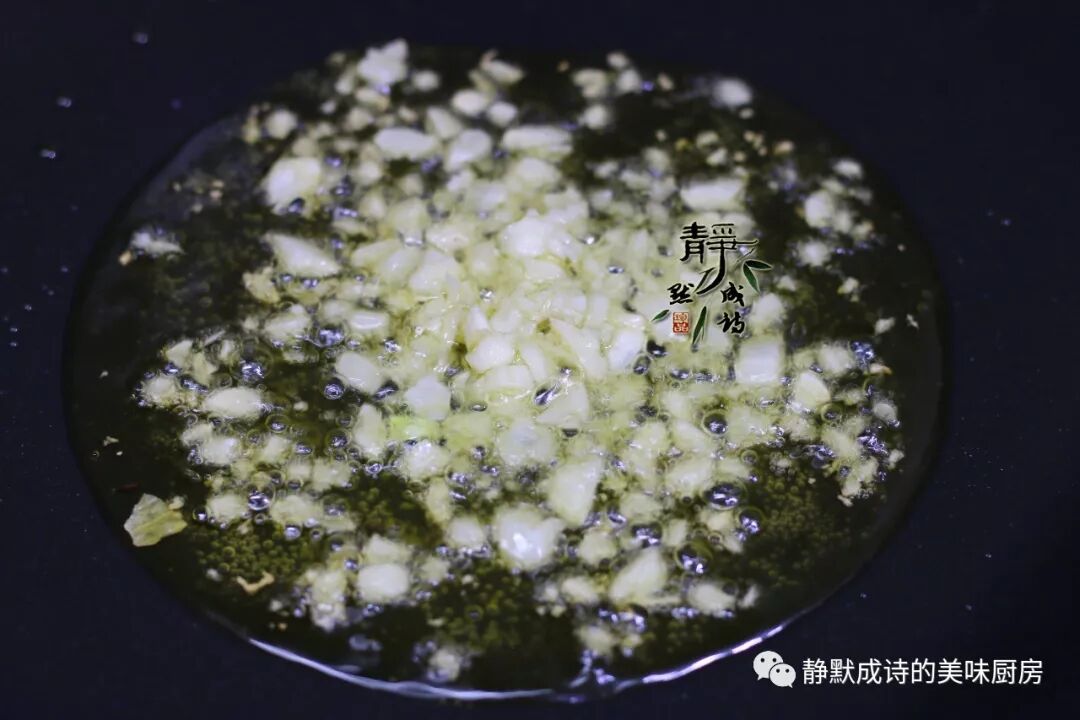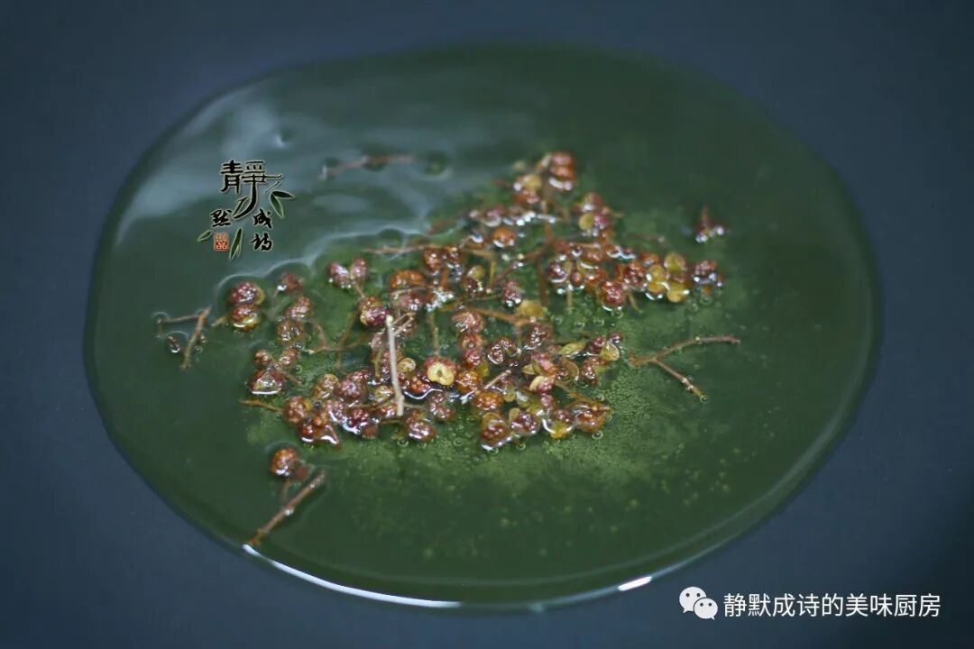 3、蒜切末;热锅凉油,先下花椒,小火炸出香味儿,注意这里,花椒要凉油下锅才能充分炸出其香味儿。