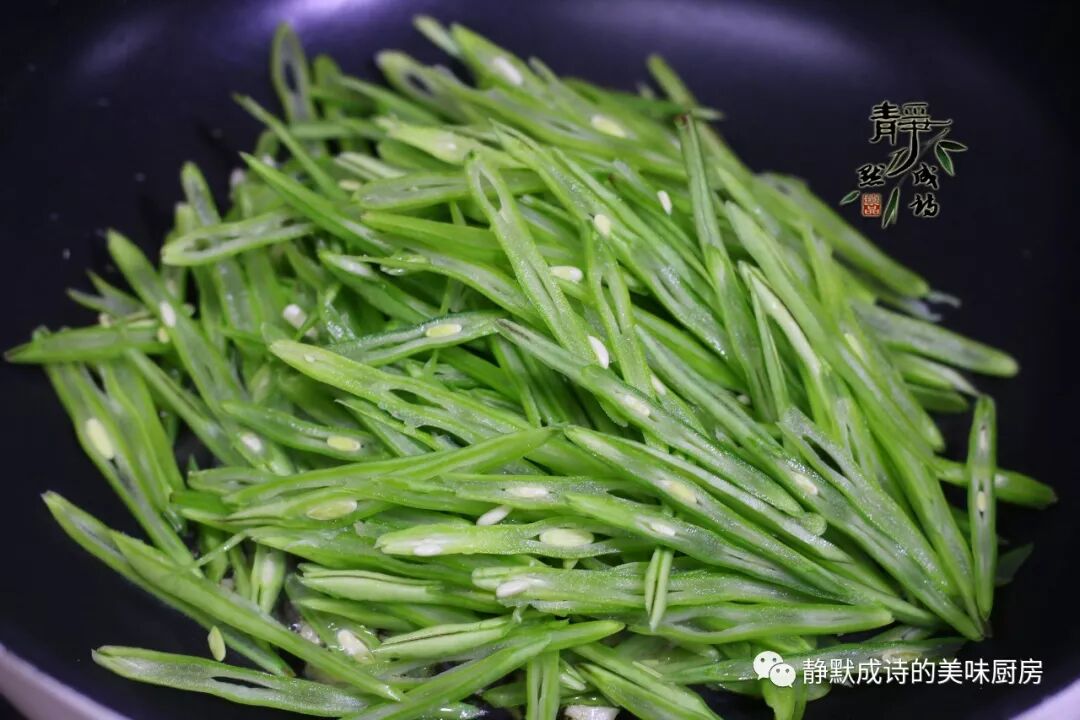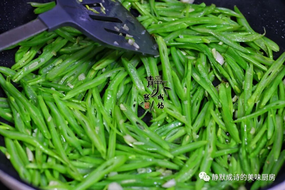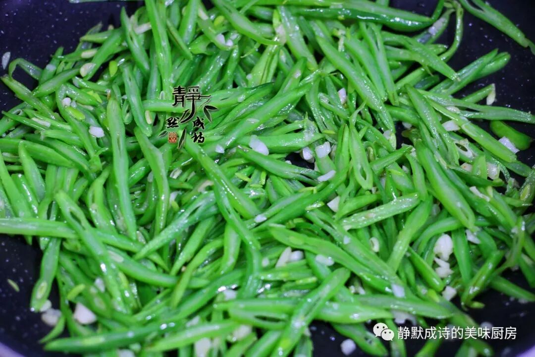 5、倒入扁豆角丝,中大火翻炒。这里不要担心会炒糊,豆角很嫩,一会儿还会出点汤。