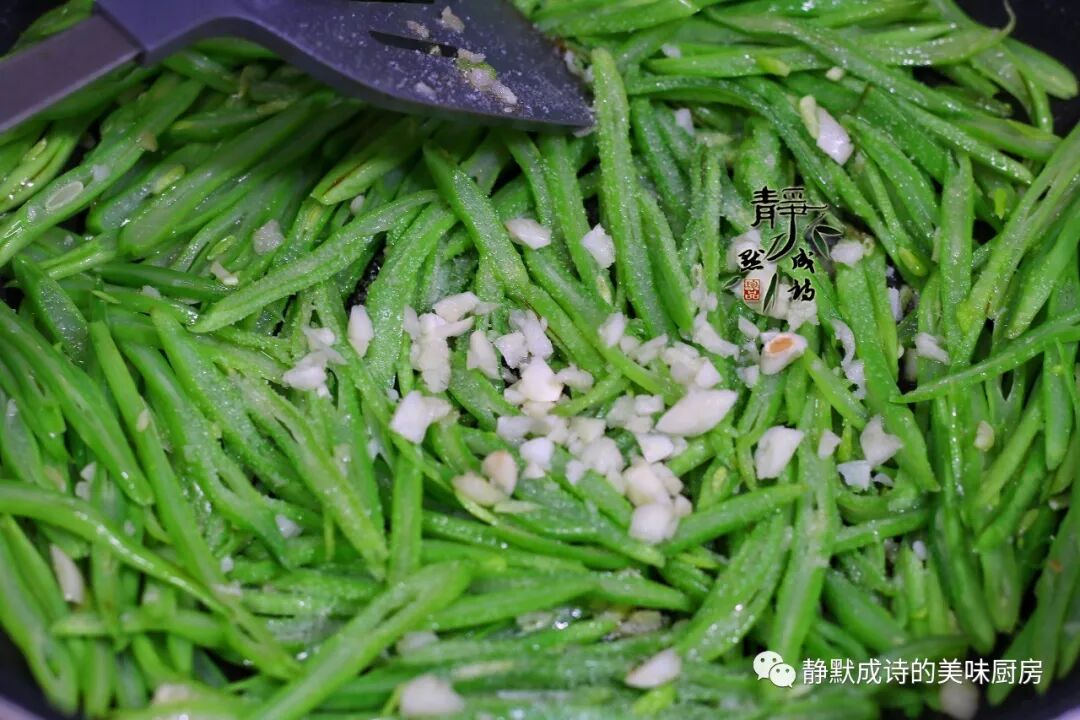 7、豆角丝炒至变色之后,调入余下的蒜末和盐。