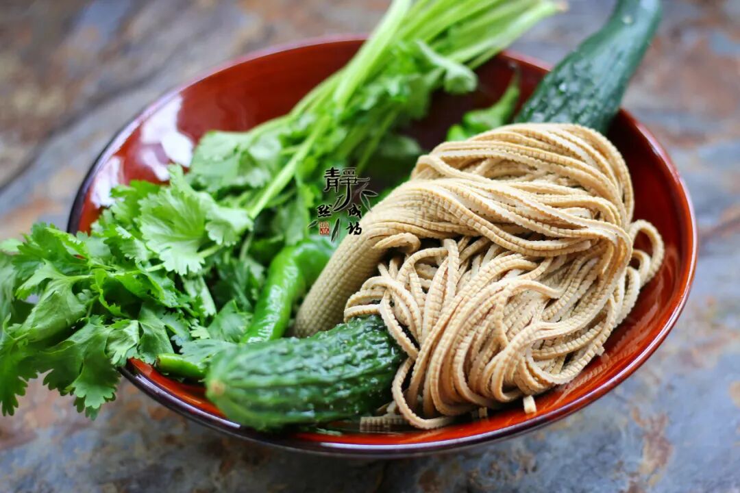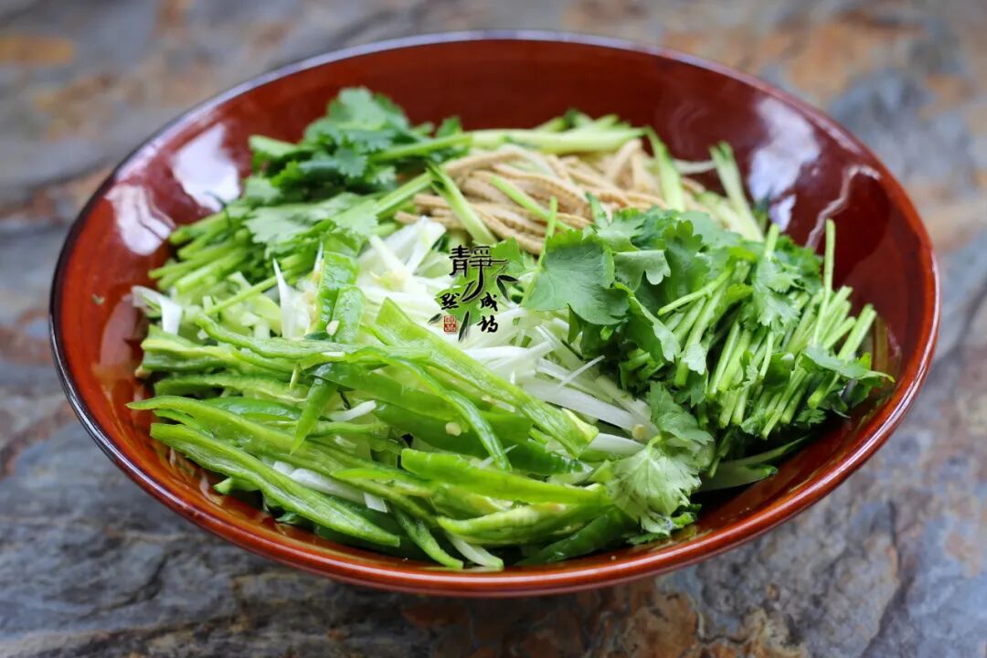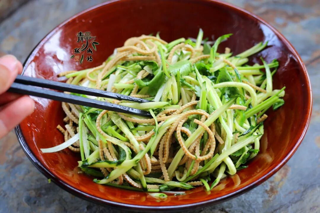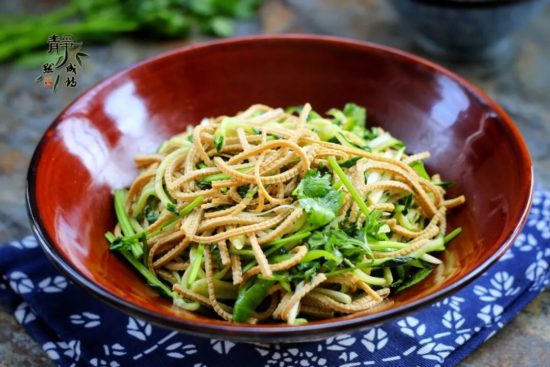 由于是蔬菜生吃,所以这些蔬菜要在淡盐水中浸泡一下以杀菌,夏天饮食尤其要注意卫生,防止引起肠胃不适;这道快手菜在我家夏天的餐桌上几乎天天出现(出现的多是普通的豆腐丝),补蛋白补维生素,多吃有益。