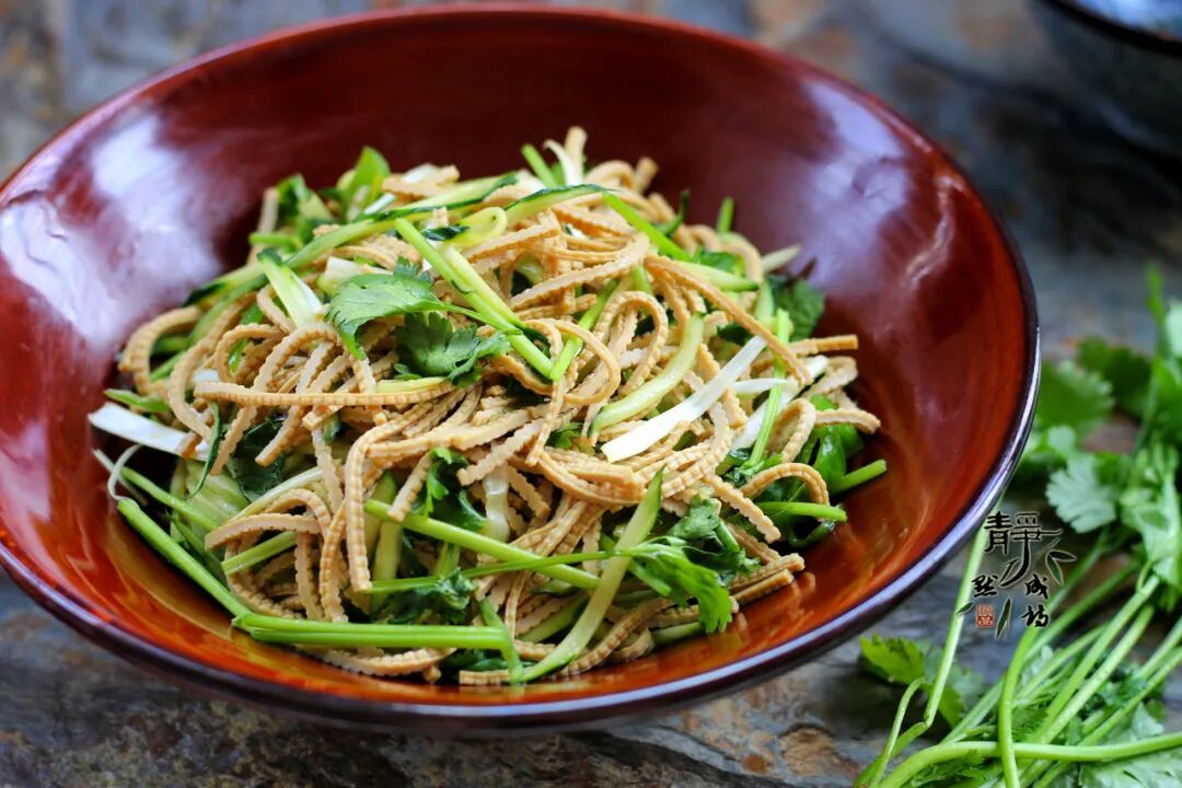 【材料】:豆腐丝1把、黄瓜1根、香菜5棵、尖椒1个、大葱1根、生抽2汤匙、陈醋2汤匙、香油少许。