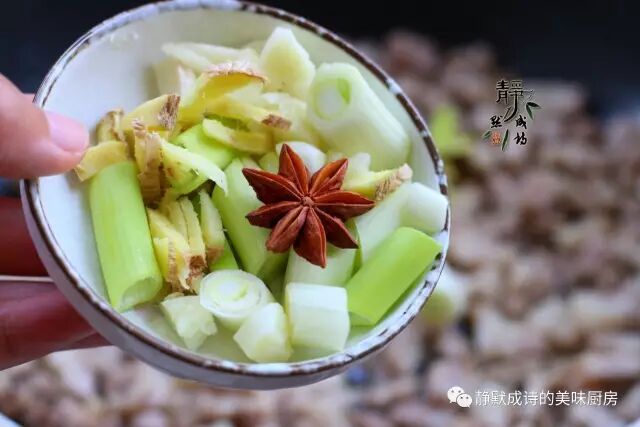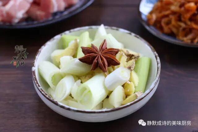 3、葱姜蒜改刀,备好八角。