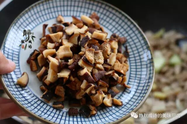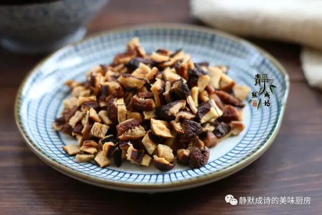 4、干香菇提前泡发,去梗留伞盖,切丁。