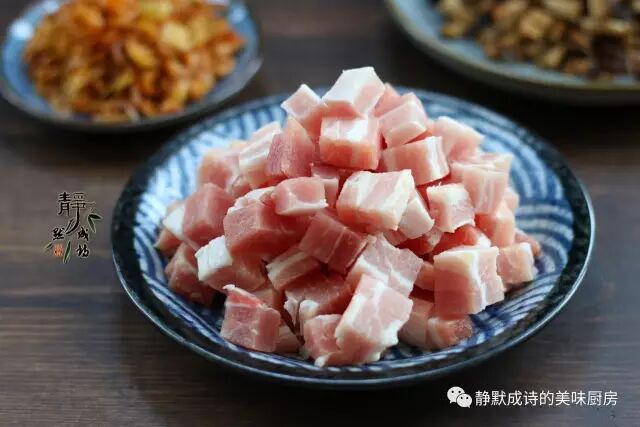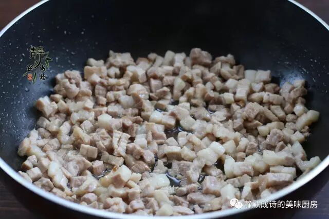 5、热锅热油,先下五花肉丁,小火炒出五花肉的肥油。