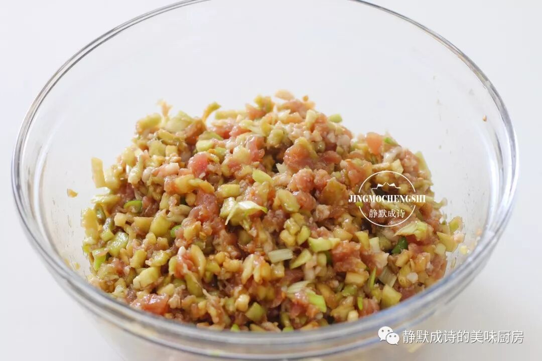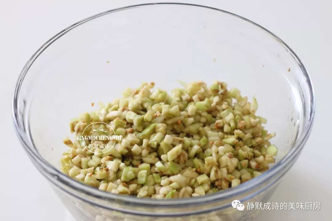 茄子得去皮,不然茄子皮会发硬,不好咬不好嚼;茄子水分大,必须提前切丁腌制出水才能入馅儿。