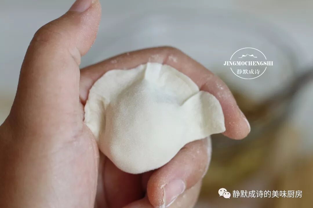7、案板上撒点儿干面,一一擀开饺子皮儿,拿起一个,放上多多的饺子馅儿。