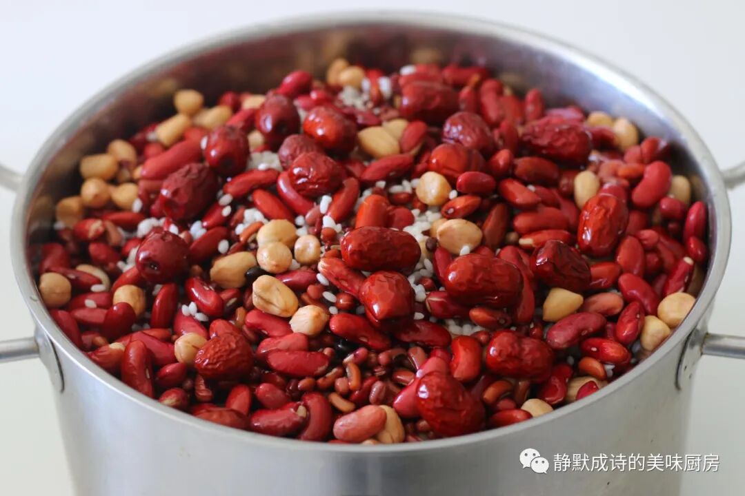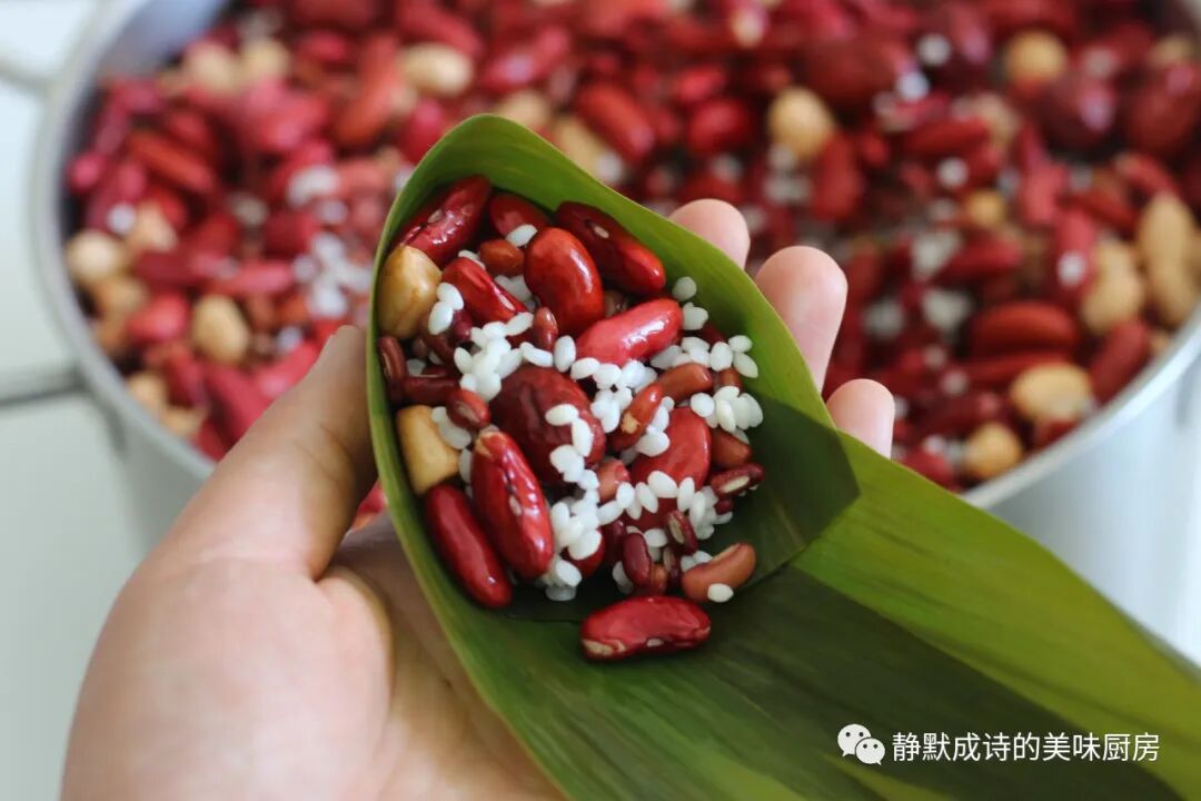 1、糯米和所有的豆类都需要提前浸泡。红豆、红芸豆、赤小豆这些豆类,我通常要浸泡十多个小时,才容易煮熟。我爱吃豆,尤其是红豆,所以,我放了这三种红豆,其中红芸豆是最爱。特地放了赤小豆进去,口感与小红豆一样,但它能祛湿,对身体好。米和豆的比例不固定,大家完全可以按照自己喜好来。我放的豆类比米还多,嘻嘻。