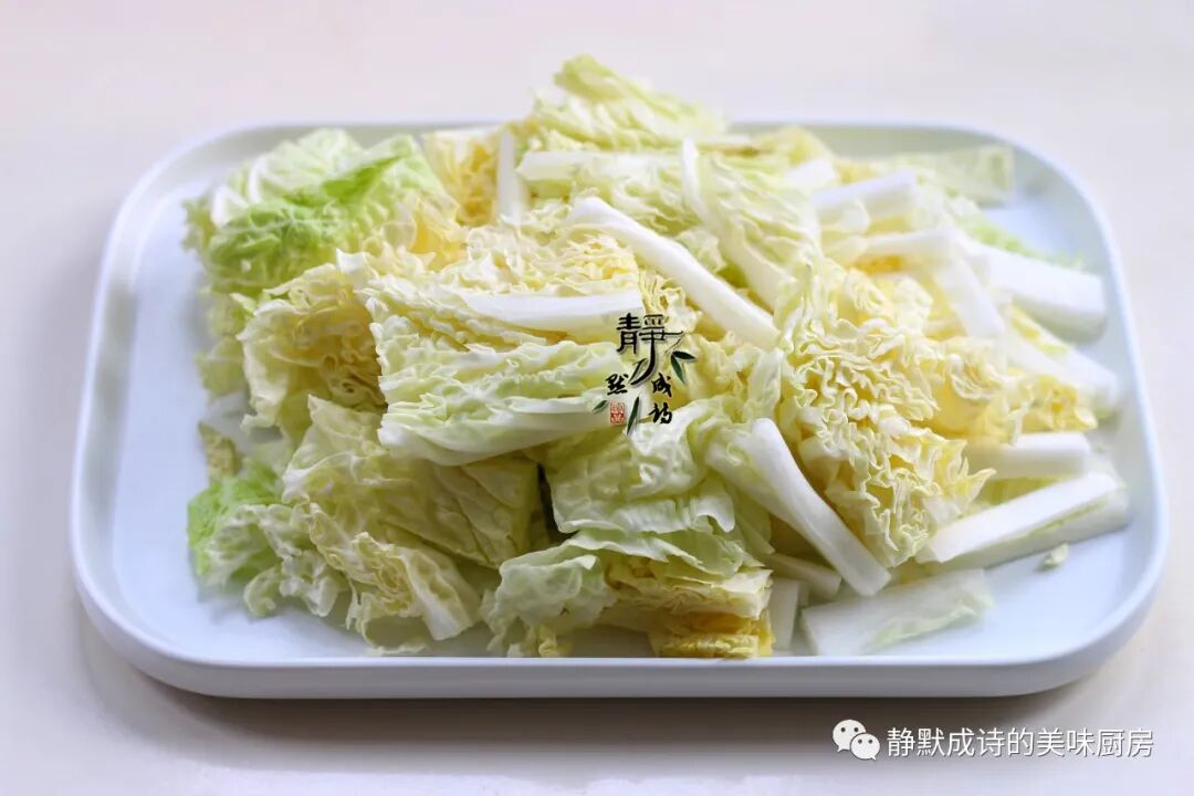 1、白菜剥掉最外面几层叶子,切条待用。我家吃白菜,最外面几层叶子是用洗的,里面的白菜不洗直接切,不知道大家平时是怎样的。