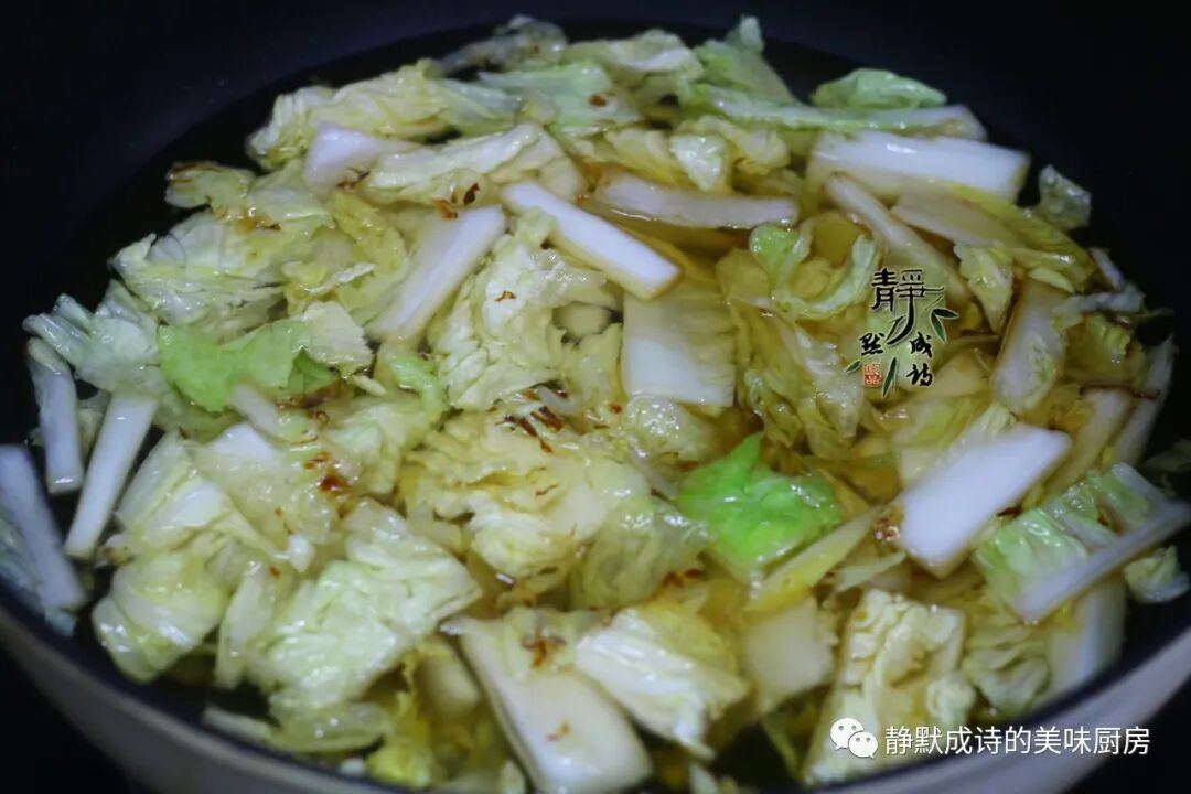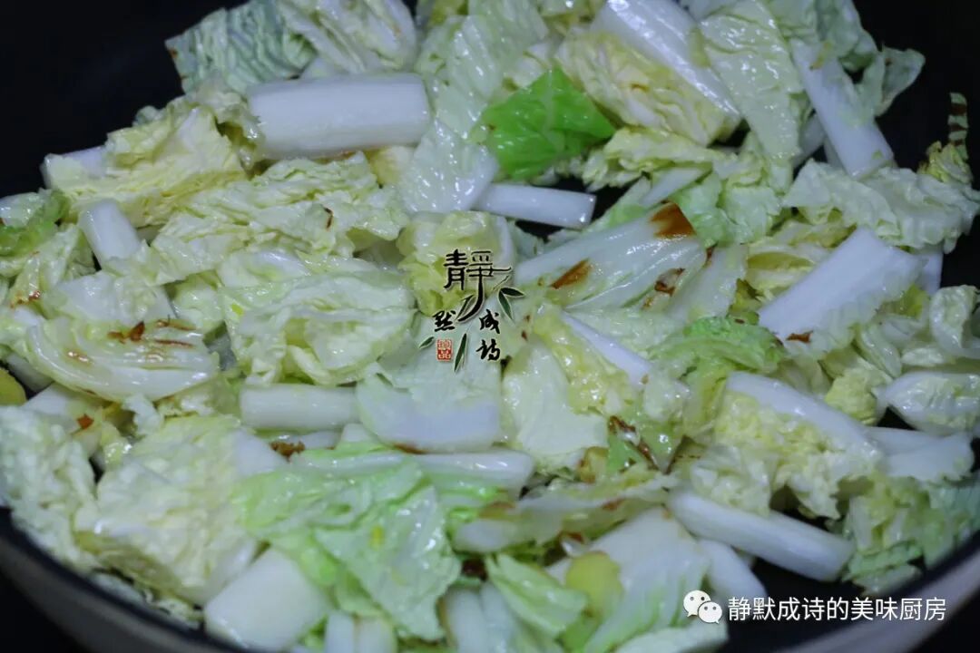 4、把白菜倒进锅中不停翻炒几分钟,把白菜炒至微微发软。