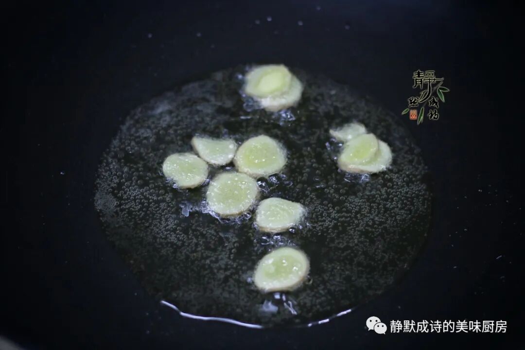 3、热锅热油,小火炝香姜片。