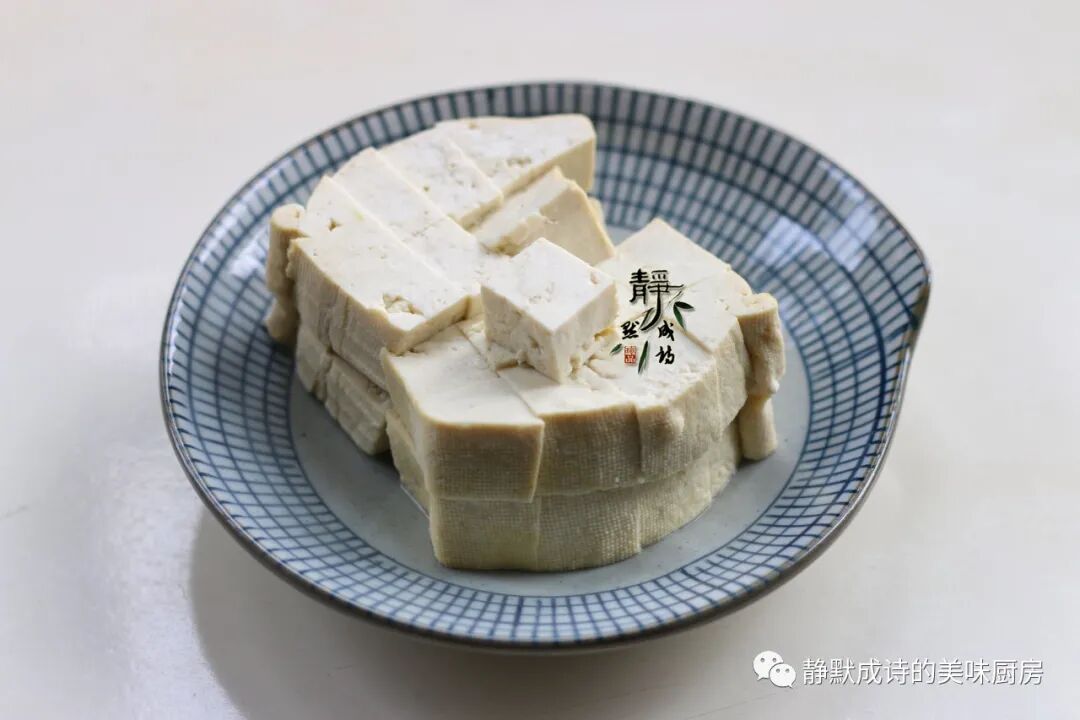 2、把北豆腐切成四方块儿,大小要尽量保持一致。