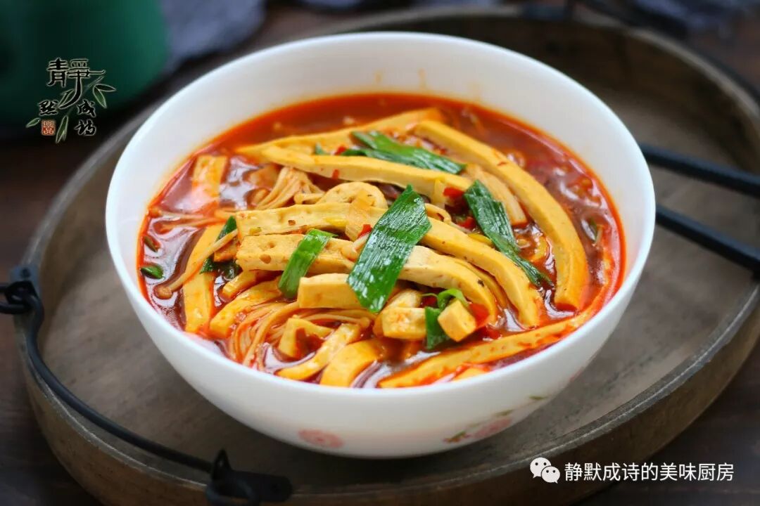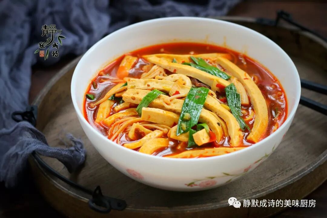 去菜市场,发现有卖干豆腐的,果断买几块儿,顺便买点儿金针菇,再捎上一把蒜苗,一道下饭菜就有了。