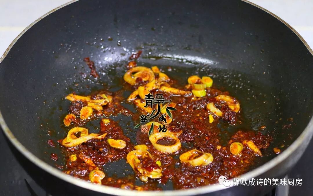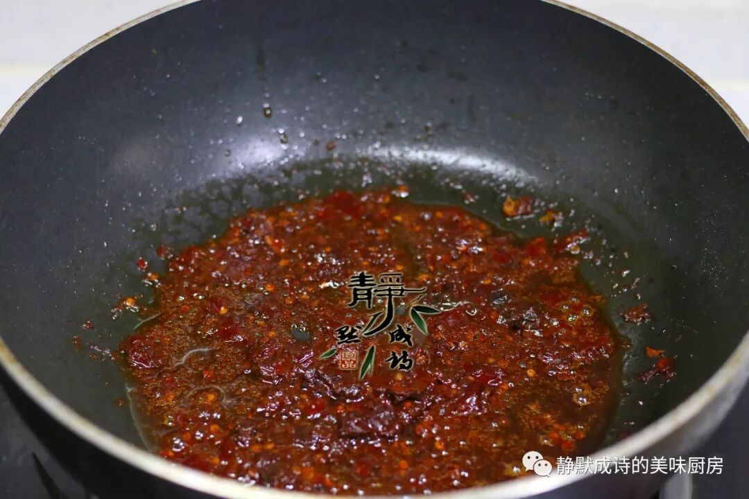 4、热锅热油,放郫县豆瓣酱小火炒出红油。