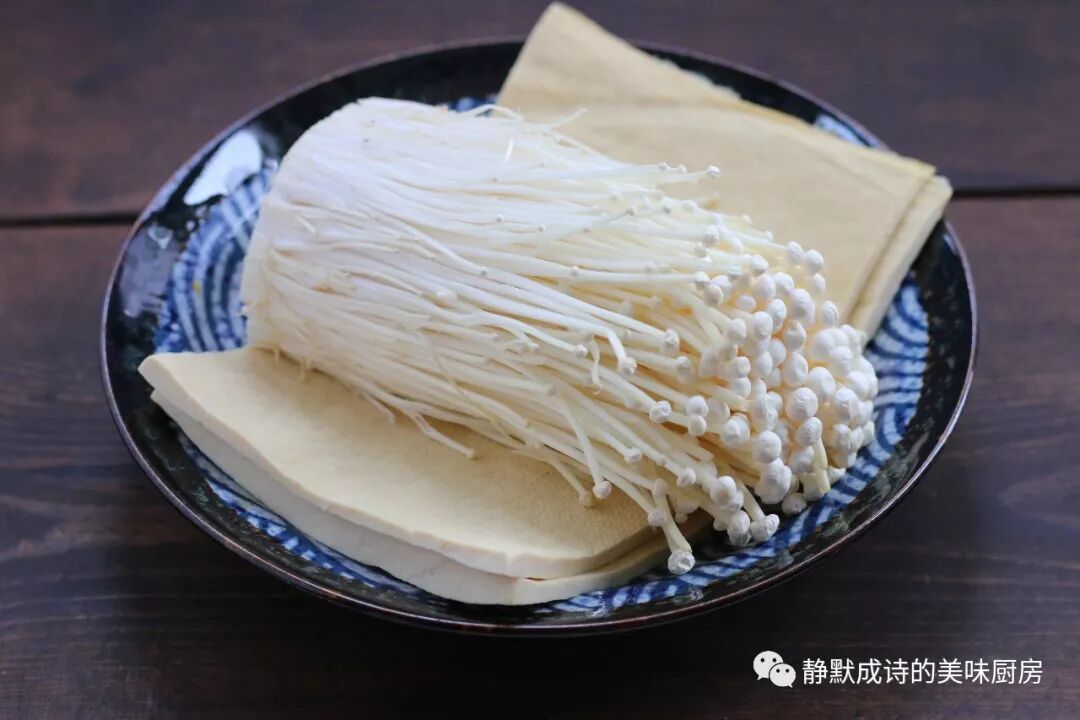 3、干豆腐切条,金针菇切掉根部洗净撕开。