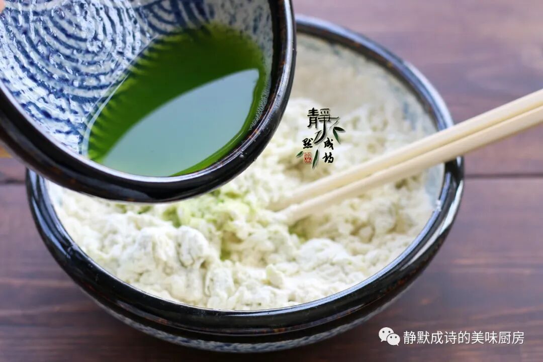2、有了黄瓜汁水,我们就用它来和面。把黄瓜汁水边缓慢倒进面粉中边搅拌成面絮状。汁水不够,清水来凑。