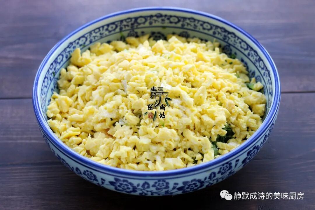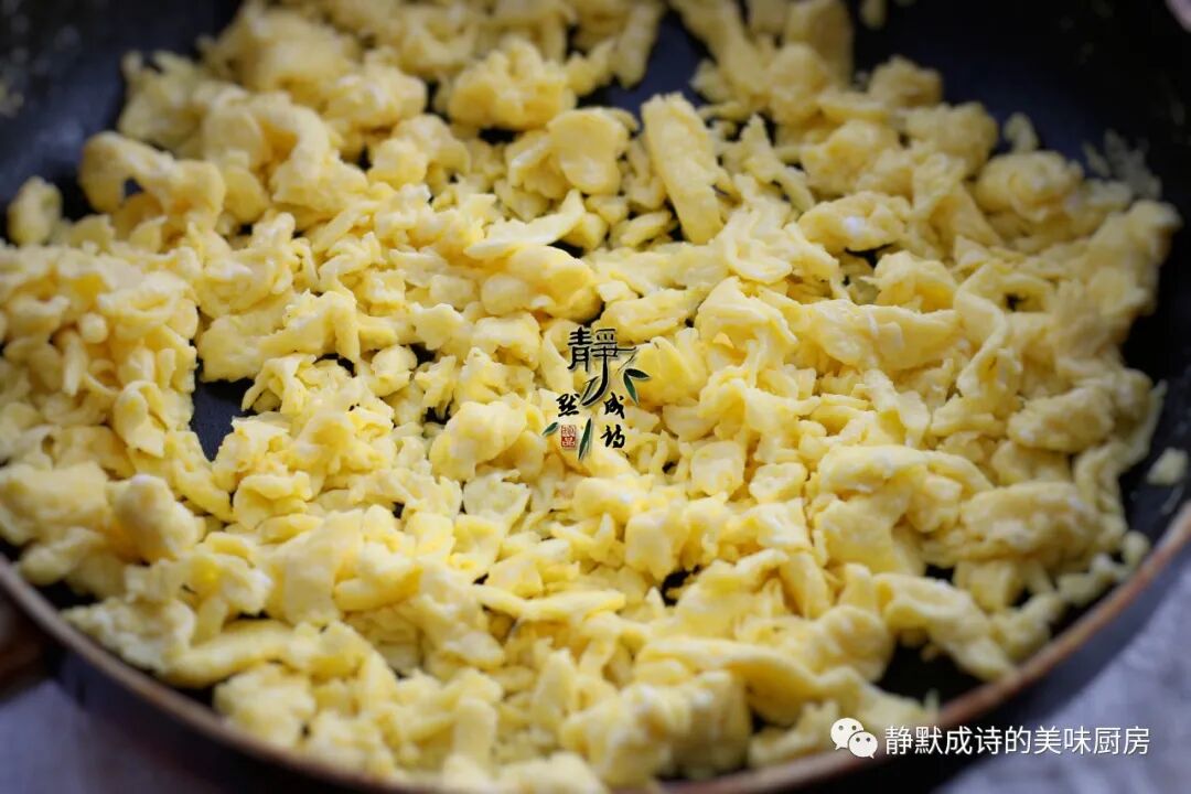 4、把鸡蛋打散,顺一个方向搅拌均匀,然后炒成小块儿,晾凉待用。
