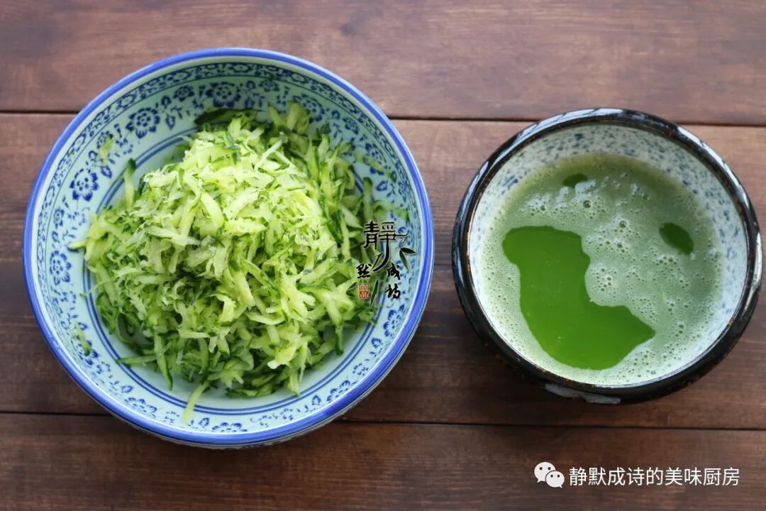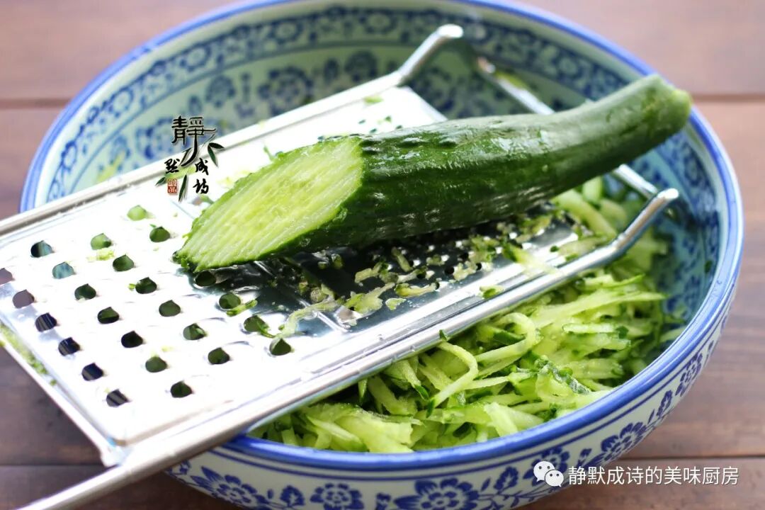 1、首先,把黄瓜洗净,用工具擦成细丝,擦丝的过程中就会有水分析出,之后攥一把黄瓜丝,挤出水分。挤出来的黄瓜水不要扔,我们用它来和饺子面。不浪费的美味,既增加了营养,又给饺子皮增添了清香气,还能让饺子皮有一抹淡淡的绿色,非常的赏心悦目。所以,你看,下厨房的过程也可以是是非常愉悦的过程。