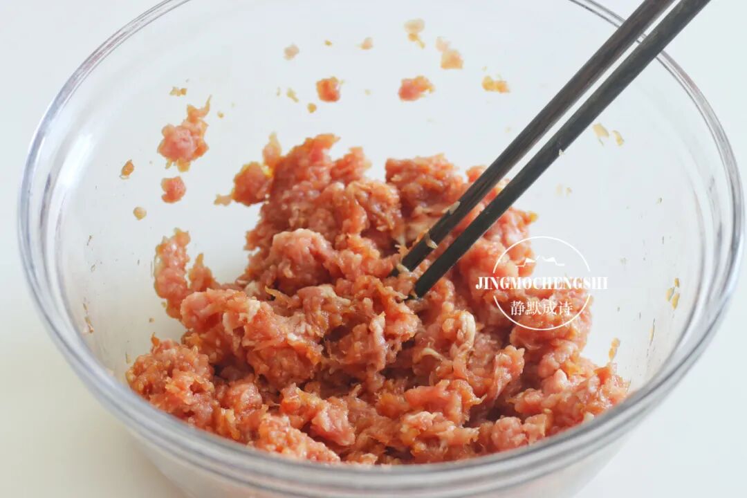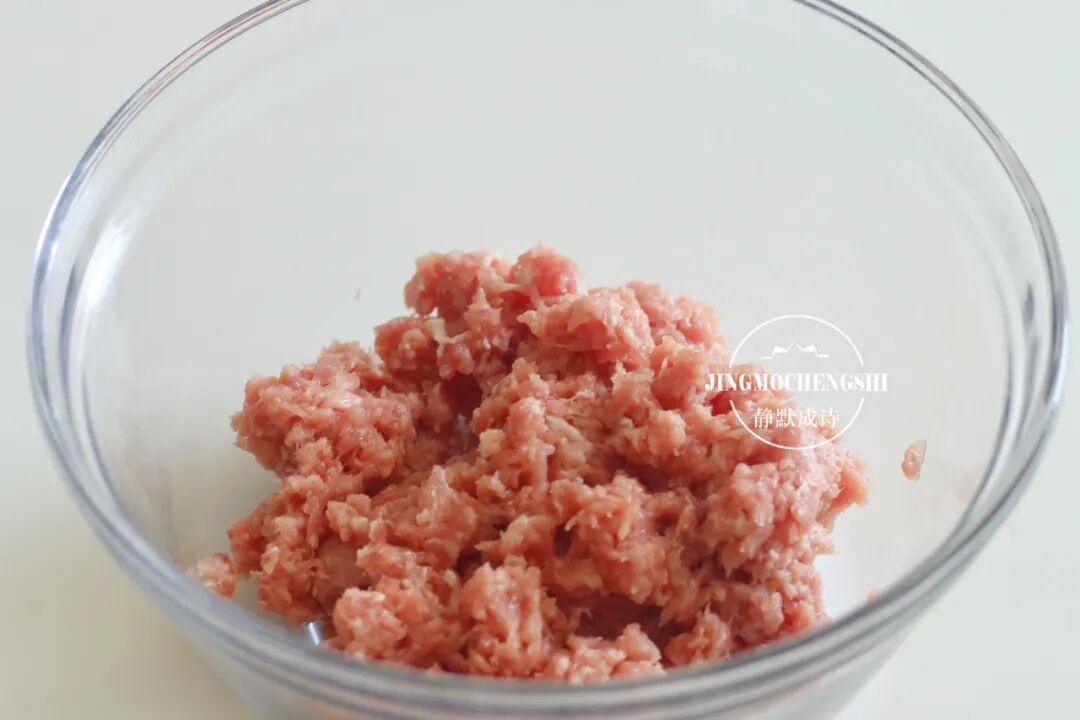 2、猪肉我选的纯瘦肉,其实选择2肥8瘦或3肥7瘦的猪肉吃着最香,因为有猪肉本身的油脂嘛!但为了不会吃胖,我这次用的瘦肉,为了吃起来不柴,我后面用到了鸡蛋。把猪肉绞成肉馅儿待用。
