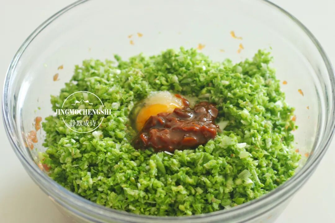 5、把绞好的豇豆放进肉馅儿中,调入鸡蛋、黄豆酱、生抽、盐、熟花生油。