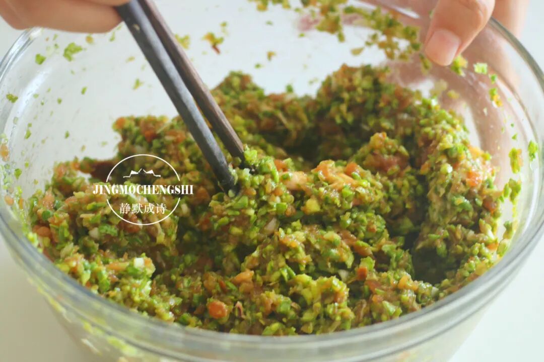 6、用筷子顺同一个方向搅拌均匀,我们的饺子馅儿就调好了。