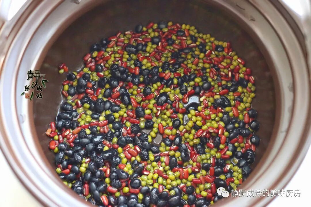 3、把洗净的赤小豆绿豆和黑豆放进电饭煲,加入足够的清水,可以根据个人喜好再加些冰糖或红糖。把豆子煮软,吃豆喝汤即可。