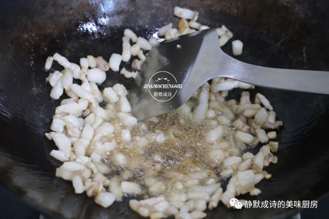 4、热锅热油,先加入肥肉部分,小火煸炒出油。