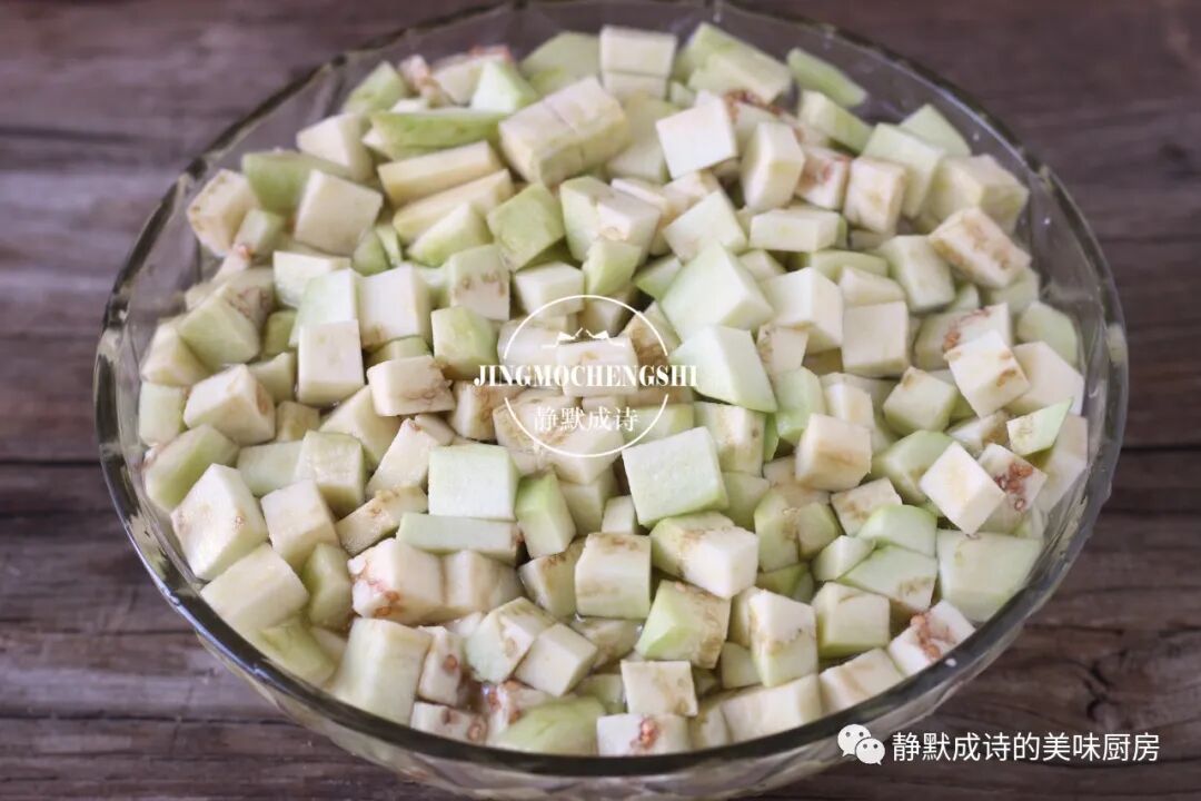 3、茄子去蒂去皮,切成小方块儿,立马用清水浸泡上,防止茄丁氧化变黑。