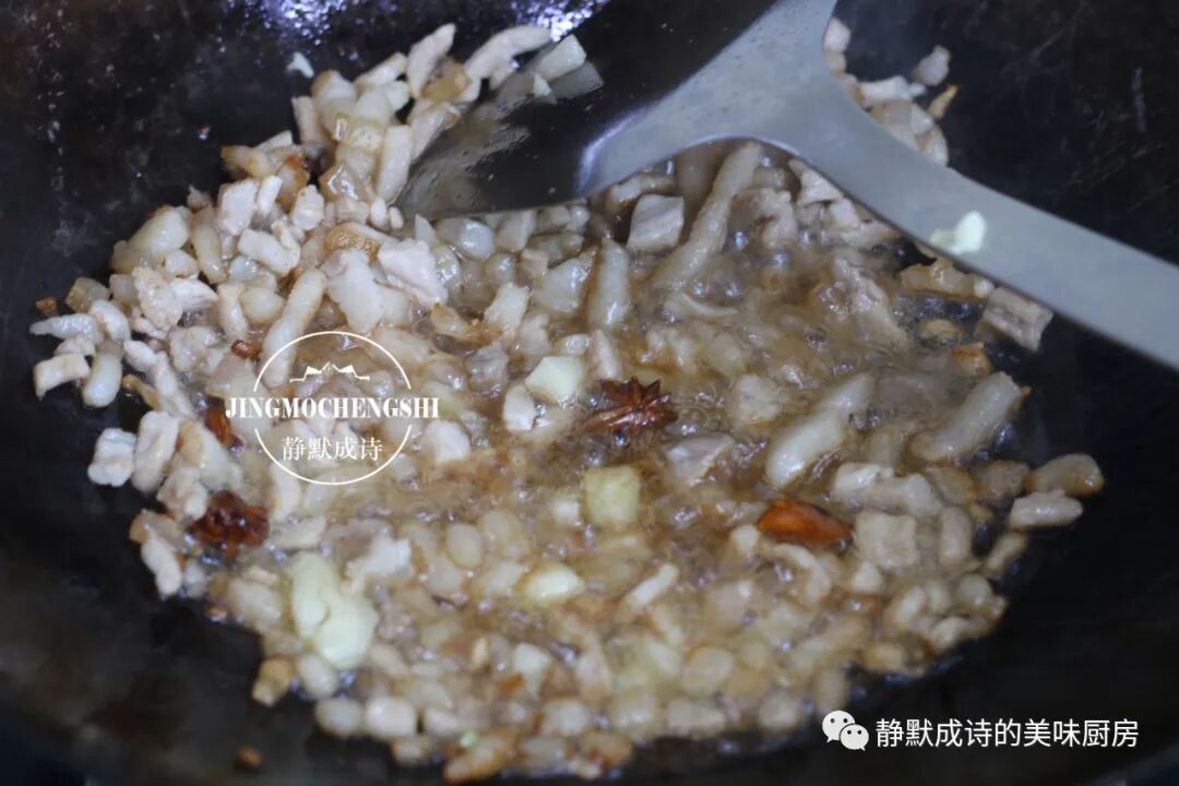 5、再加入瘦肉丁,继续小火煸炒至变色,然后加入葱姜蒜八角炒出香味儿。