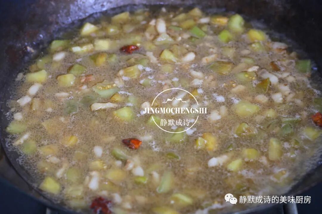 9、转中小火,继续煮,直到茄子变得软糯入口即化,即可关火(喜欢浓口的可以勾个薄芡)。这就是做好的茄子肉丁卤。茄子一定要经过煸炒和熬煮两个步骤,才会软糯入口即化,完全没有了茄子的生味儿,而且它被肥肉中的油脂所浸润,变得油香四溢,吃面时,最喜欢这个茄丁了。