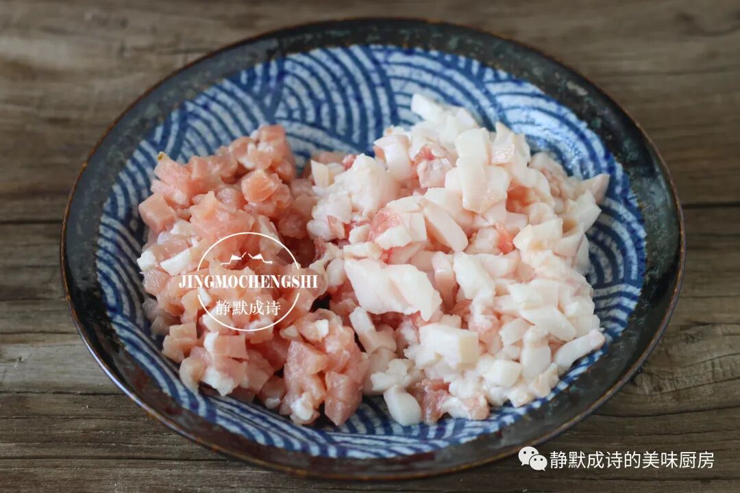 2、把五花肉去皮,肥瘦部分要分开切成小粒备用。这里请务必用些肥肉,不然这卤不香。