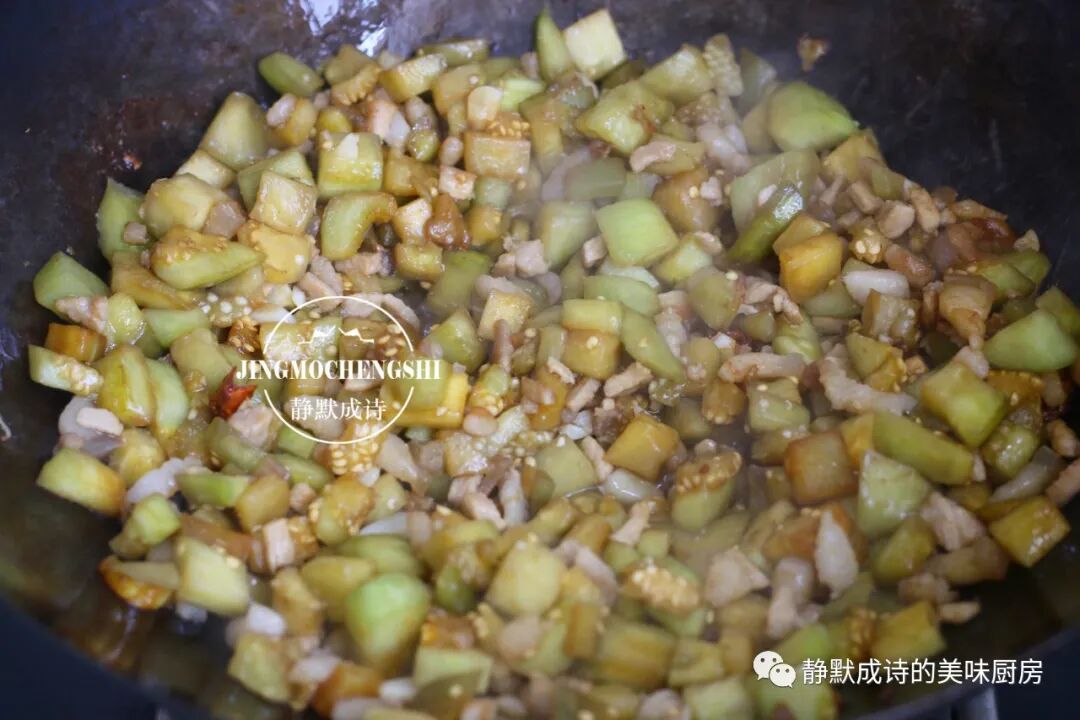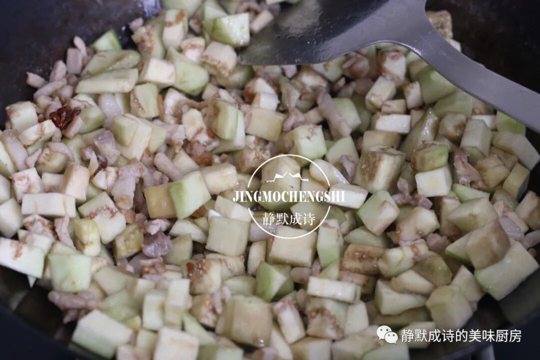 2、茄子肉丁卤要想好吃,茄子丁必须经过油炒至发软以及加水后熬煮的过程,两者少一不可。