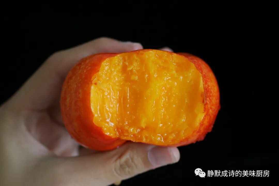 彩虹蟠桃的果肉颜色也很漂亮,而且多汁,吃的时候得小心一点,一不小心,桃汁会流的到处都是。
