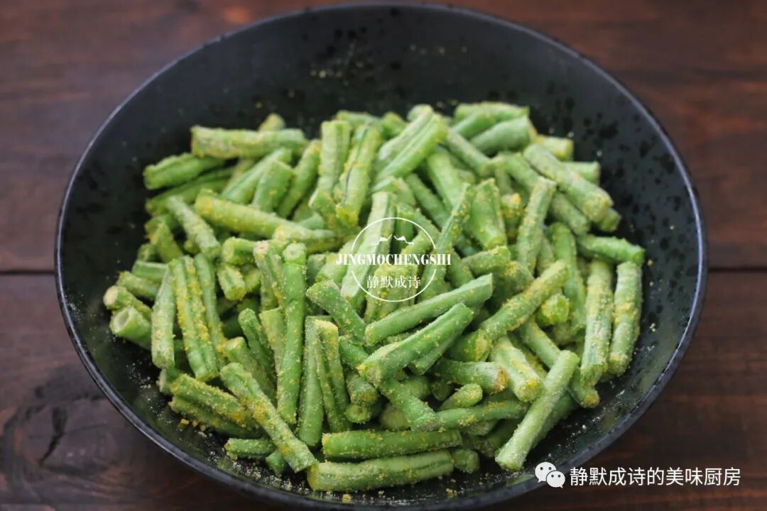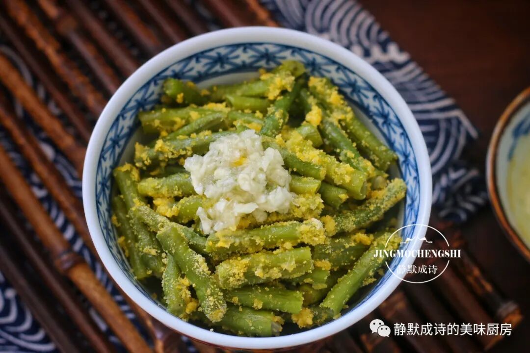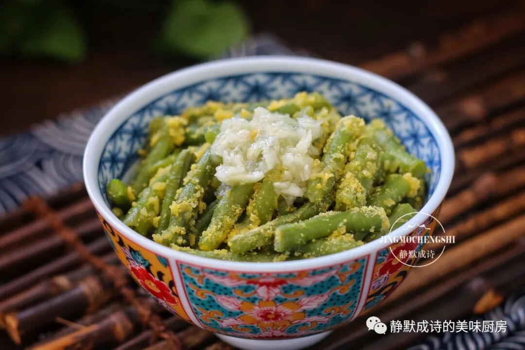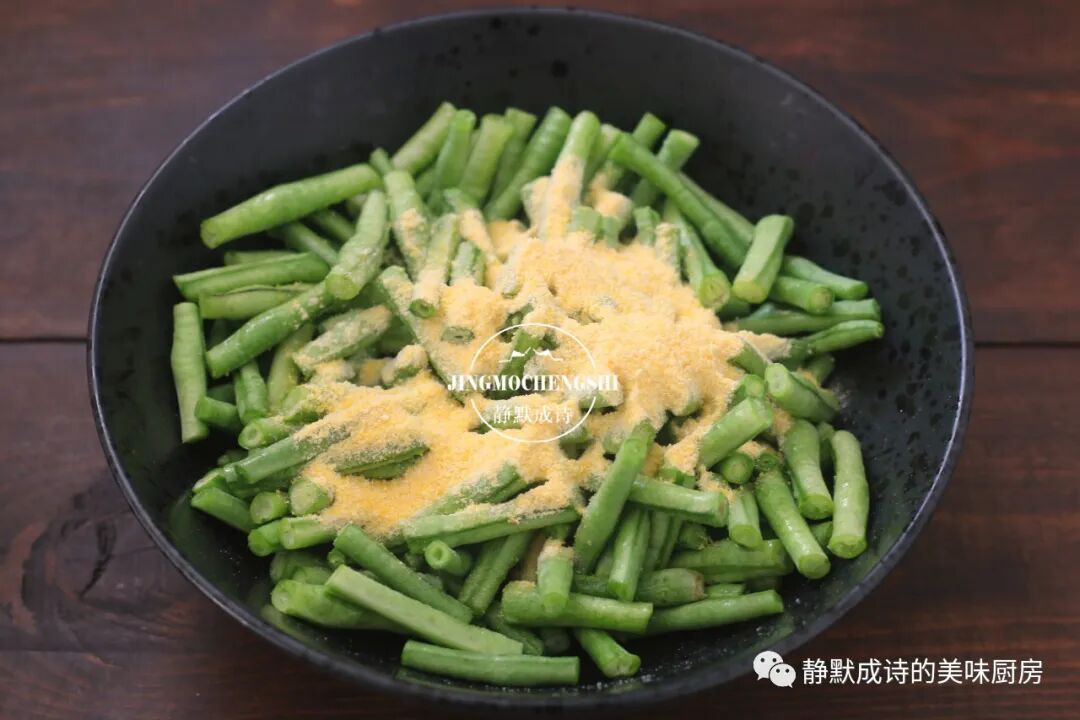 【食材】:豇豆角1把、细玉米面1小把、橄榄油少许、蒜3瓣、盐2克、香油几滴。